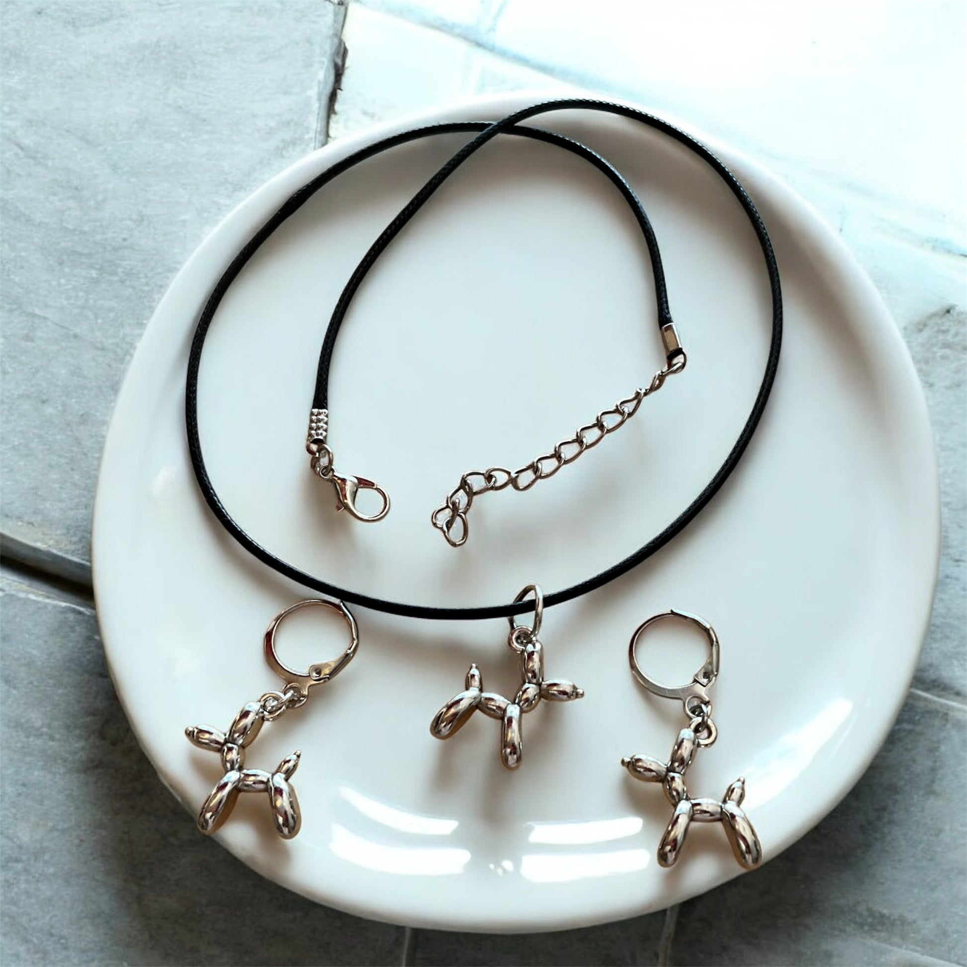 Earrings in silver metal with silver metal pendant on black waxed cord necklace