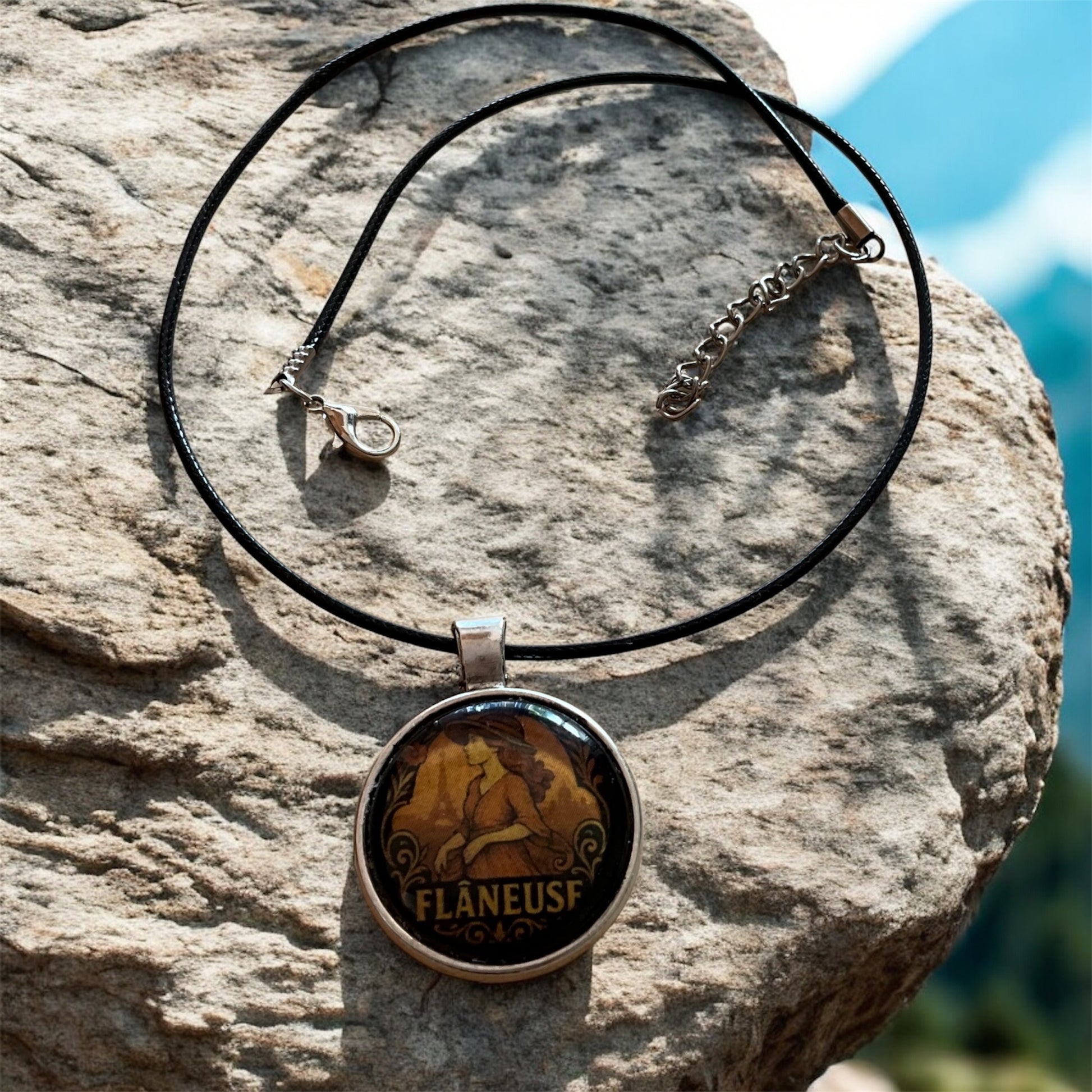 “Flâneuse” pendant with black cord necklace. Parisian original design set in metal bezel with glass cabochon and a black waxed cord necklace