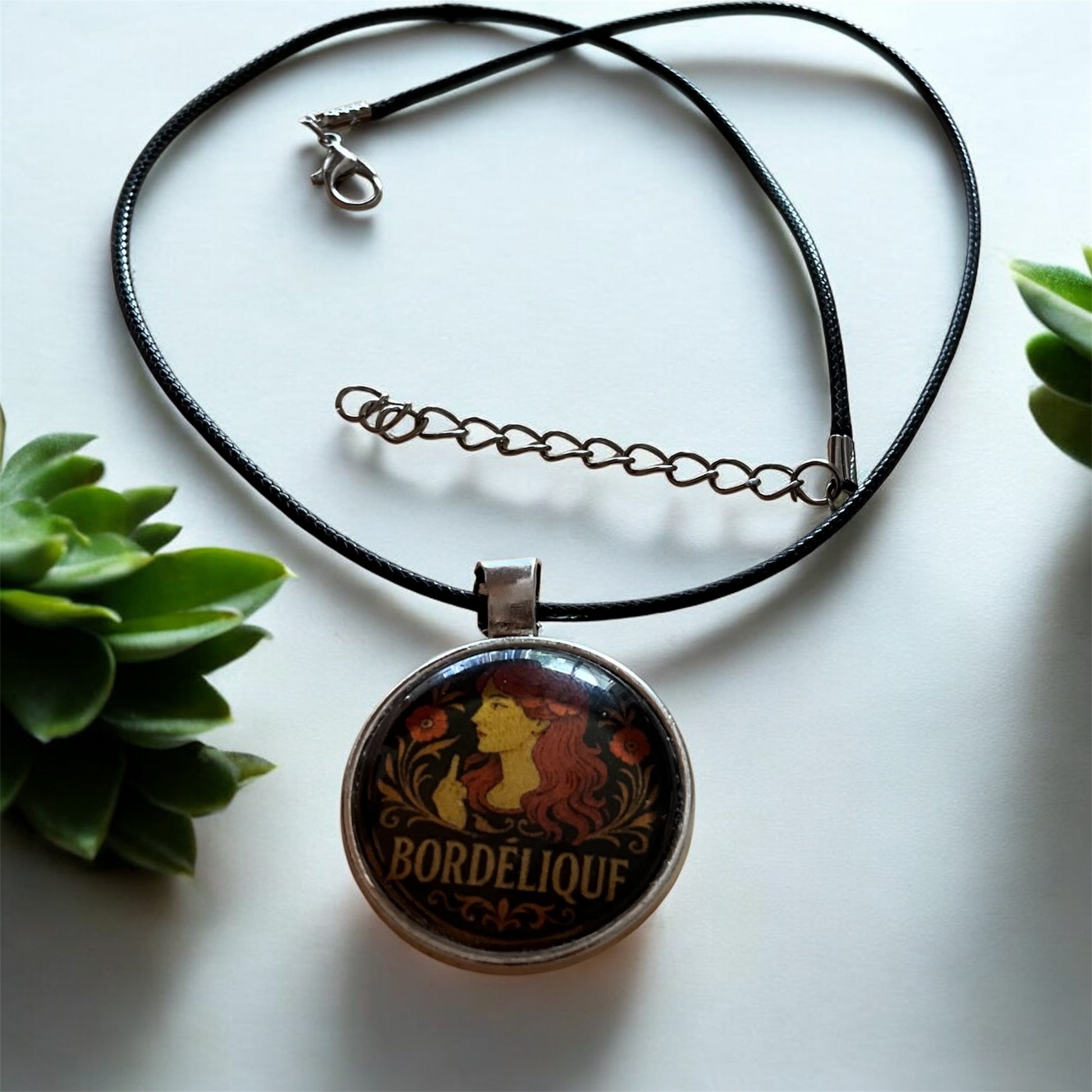 Sassy “Bordélique” pendant with black cord necklace. Parisian statement necklace with original design set in aged metal bezl with a glass cabochon and cord necklace